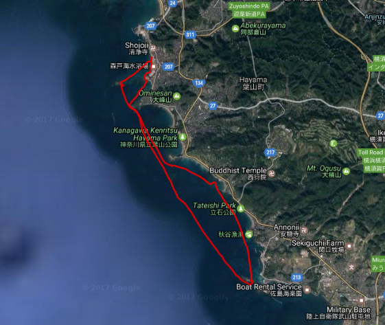 Lauched down south again, this time on a calm day. Explored a little of Arasaki Park, there was a really cool canal carved through rocks... Continued North crossing Otawa Bay into Saji Marina, through a tiny canal and landed on Kasa Island. There was a nice sandy landing spot on the island and a small Tori gate to see. After that, lapped the island and headed back.
