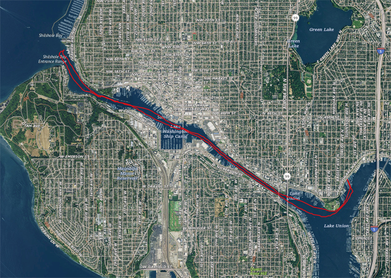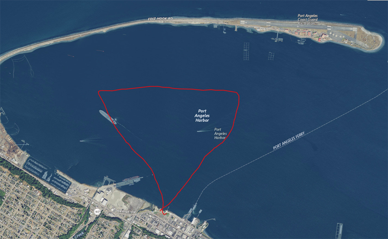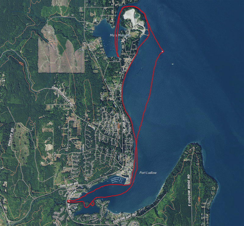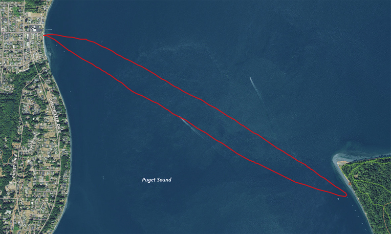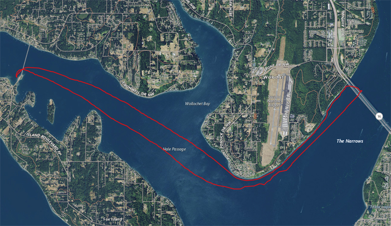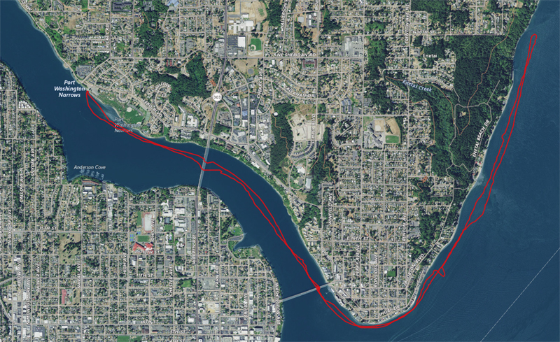 It was a tough race trying to pick the best tidal lines, plus it was my longest race yet. My left shoulder was completely dead just over halfway during the race. Seems like the best line was to race down the middle of the narrows and closest to the shore on the way back.