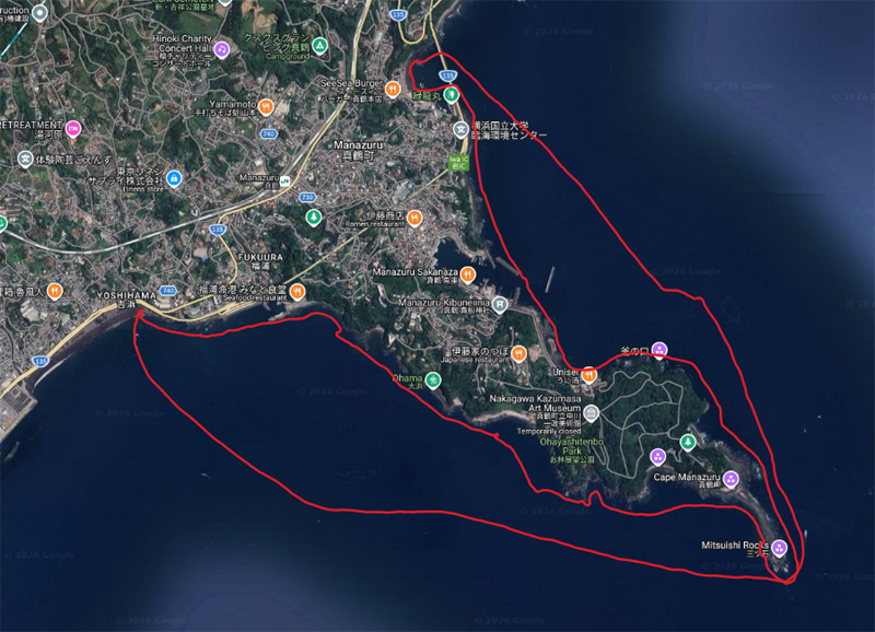 Snow last weekend, and now in the 60's. Been eyeing Cape Manzuru / Mitsuishi Rocks on Izu Peninsula since my last tour in Japan, but struggled to find a good launch point. Well, found one in a surfing beach in Yoshihama. Paddled around the cape to another nice local beach, Iwa Beach, and back. It was pretty rough around the Mitsuishi Rocks, but good practice for sure.